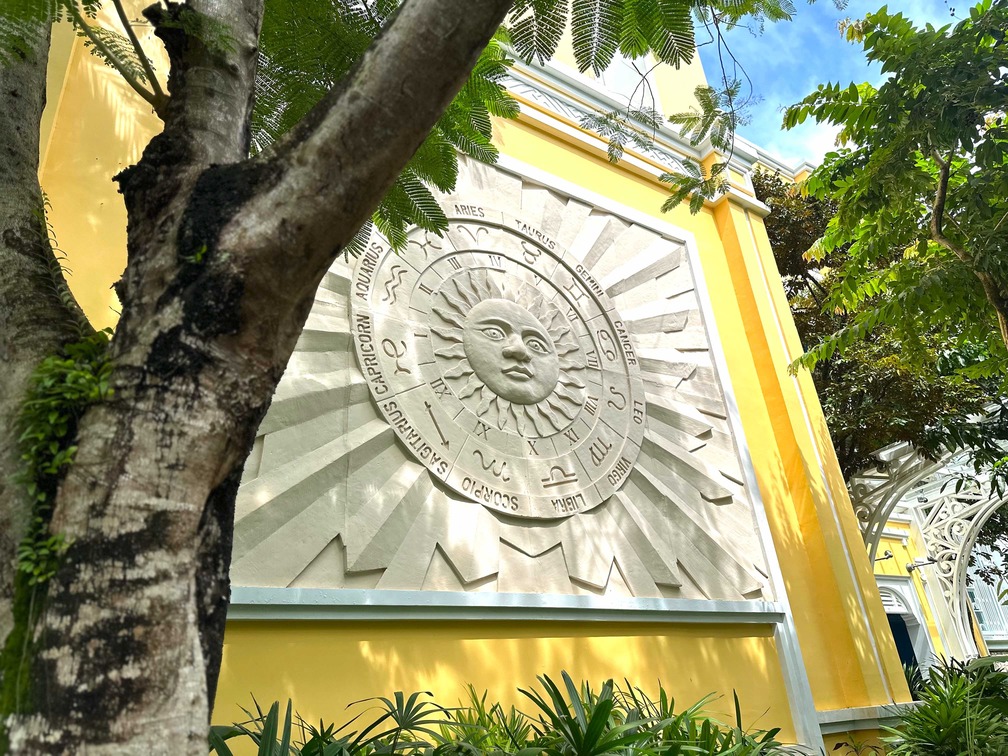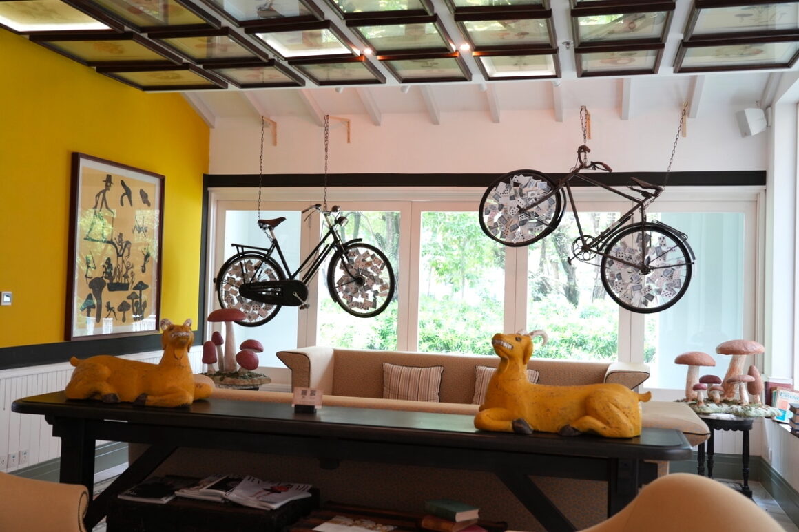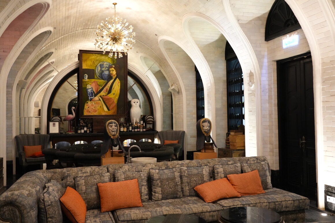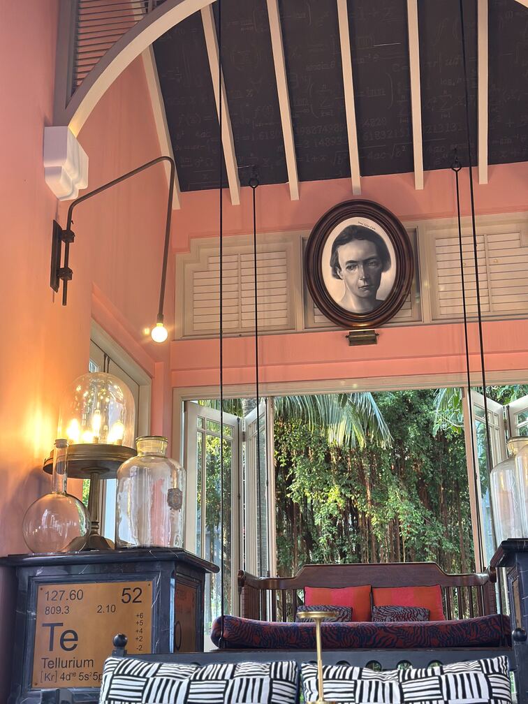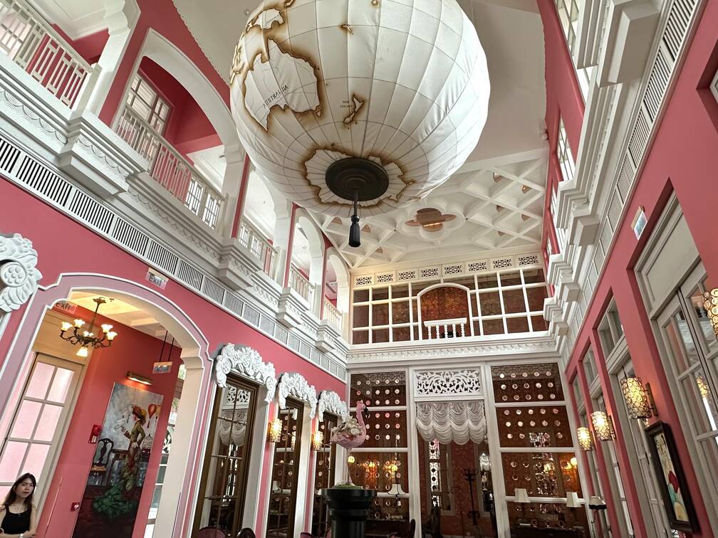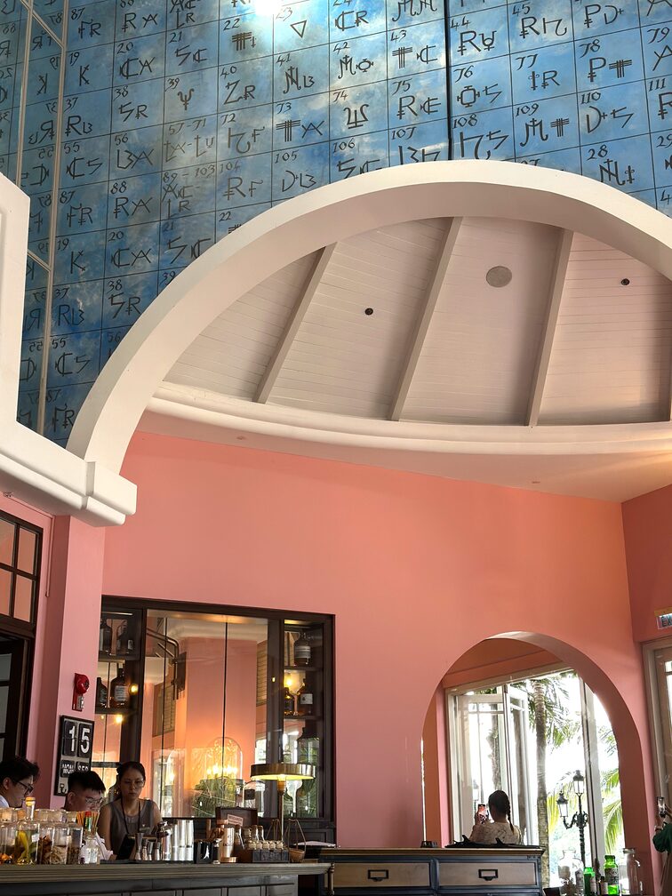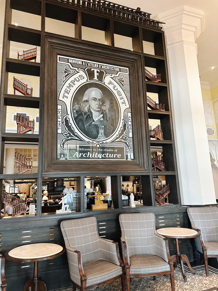運動結束,就前往全日餐廳 Tempus Fugit 享用早餐吧!整棟建築以藍綠與青色調為主,呈現法式殖民風格,配上拱窗與古典線條。走進 Tempus Fugit,別忘了抬頭欣賞——牆上竟掛滿了建築系學生上課必備的各式尺規、藍圖、繪圖指、繪圖道具,趣味十足。這座由 Bill Bensley 設計的酒店,每一棟建築、每一扇拱門、每一面牆、每一個角落都在訴說故事,也正是我如此喜愛他的原因。