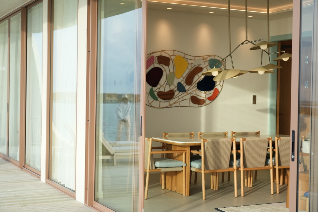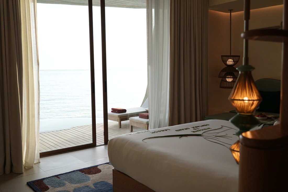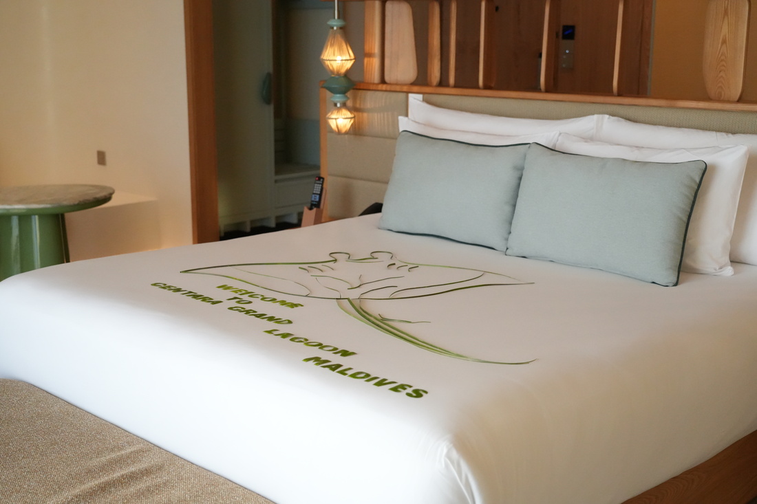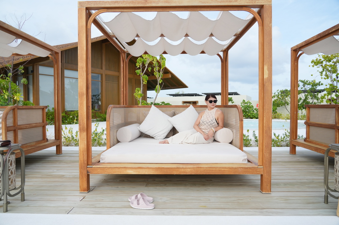 如果說 Centara Mirage Lagoon Maldives(盛泰樂幻影馬爾地夫度假村)是活力滿分的初體驗,那Centara Grand Lagoon Maldives(盛泰樂中央至尊馬爾地夫度假村)則像是給心靈放慢速度的療癒空間。搭上Buggy,越過連接兩座島嶼的橋,正式進入 Centara Grand Lagoon Maldives,立刻感受到完全不同的氛圍——海水呈現柔霧般的藍綠,陽光灑落在粉白沙灘上,整個島彷彿被輕柔的光包裹。經過前兩晚的活力奔放,這三晚我們決定要慢下來,細細品味每一刻。