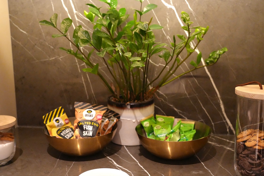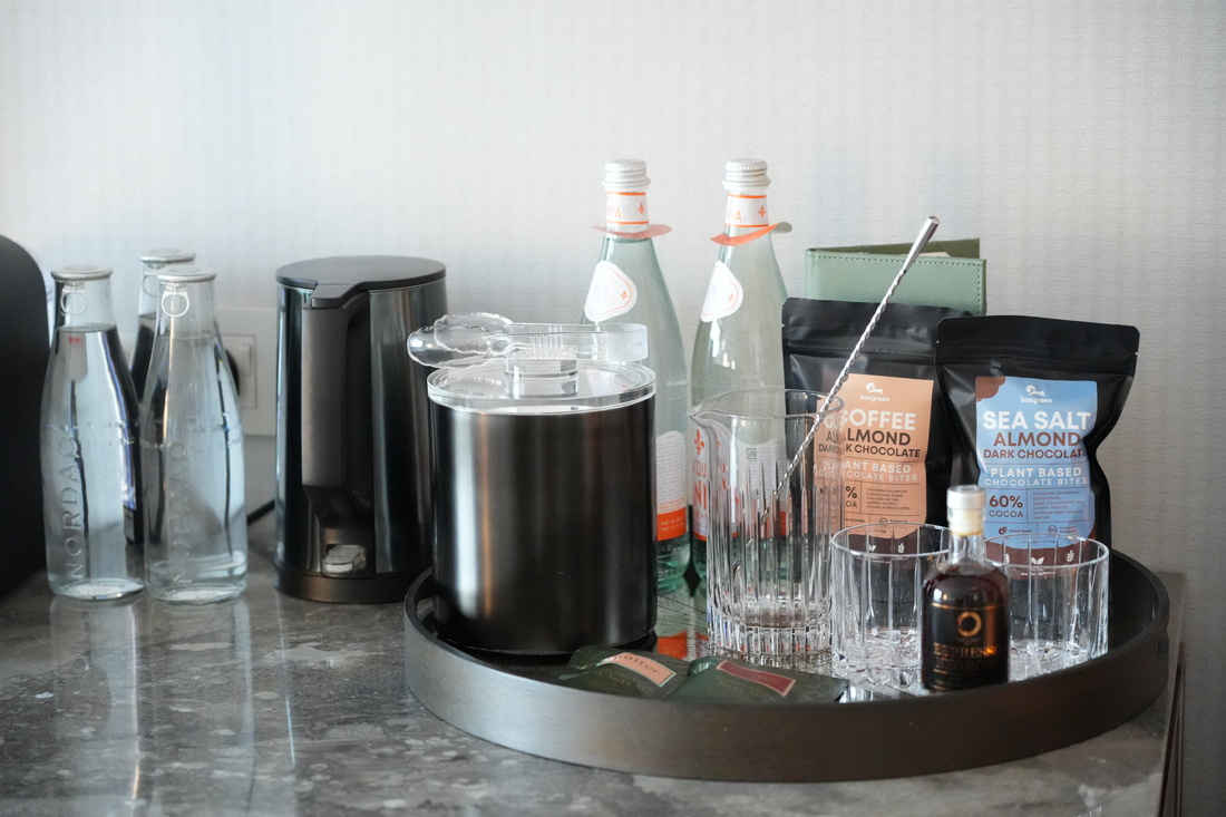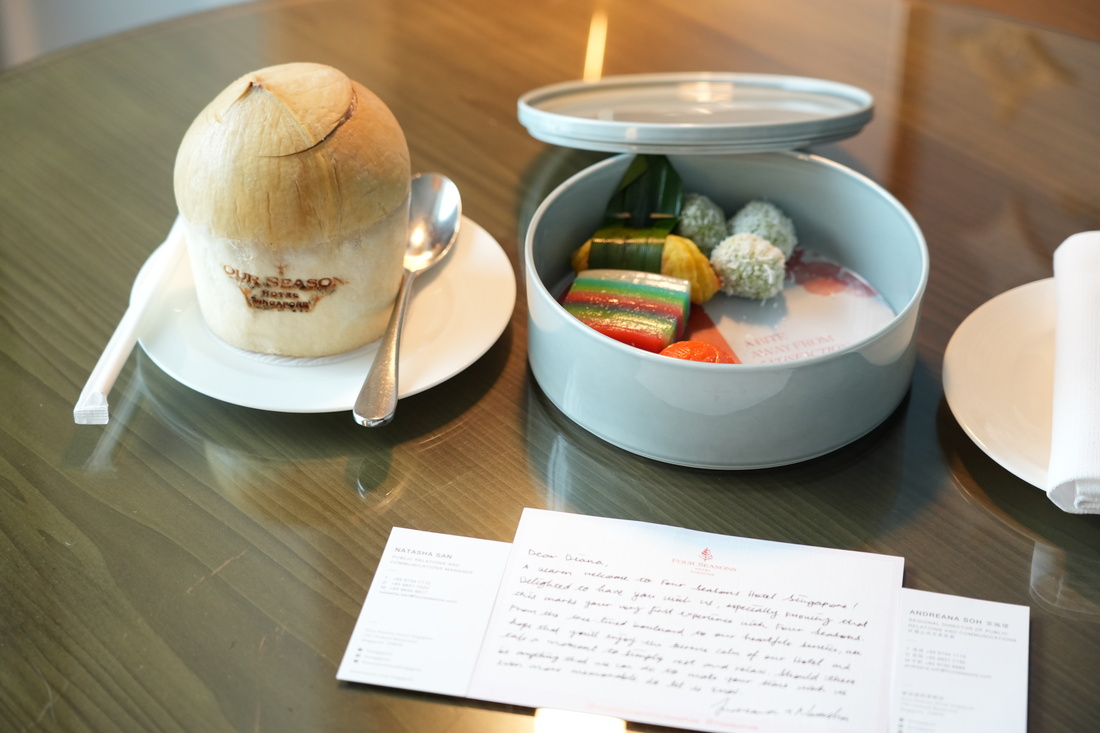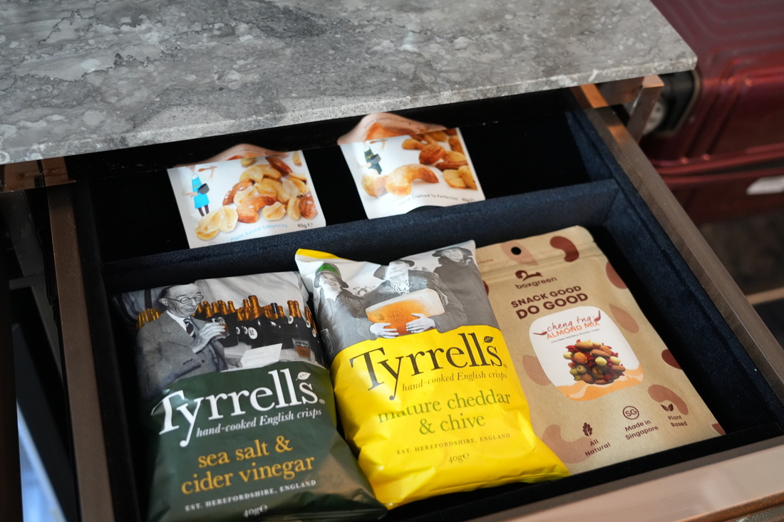 煥新後的客房,映入眼簾的是源自新加坡植物園天鵝湖的色彩靈感,淡雅的冷藍色調中點綴著清新青檸綠;搭配裝飾其間的傳統娘惹瓷磚壁畫,像是深厚的文化底蘊在現代空間跳著舞!Welcome dessert豐富用心,入房後時不時來一口精巧的點心,貪食的嘴也被照顧到了。