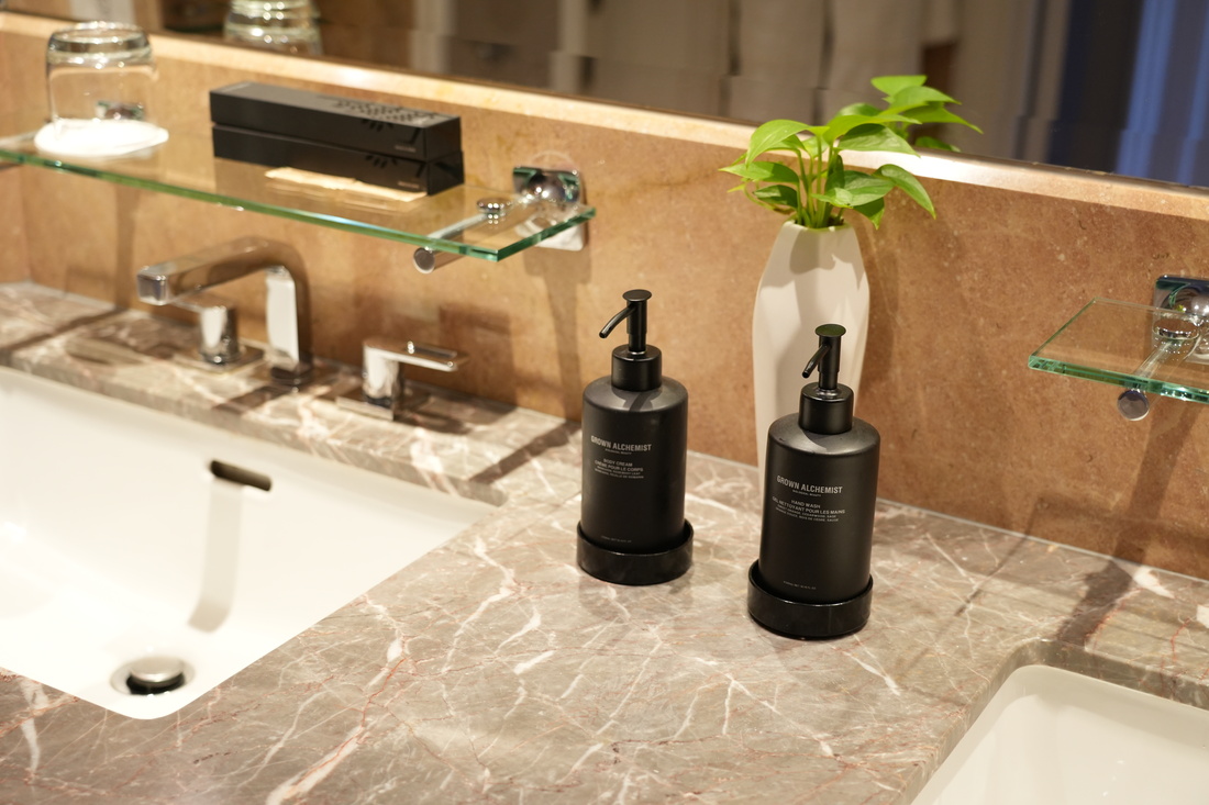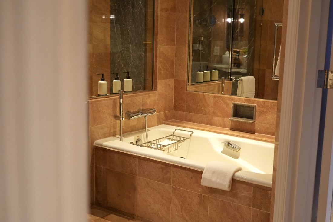 最讓我流連忘返的,莫過於那間全大理石打造的浴室。雙洗手台的設計讓洗漱變成一種儀式,浴缸旁早已備好精緻的備品。在結束一整天外頭行程後,回到房間泡入溫暖的水中,看著鏡中倒映出的暖色燈光,這份專屬於個人的私密時光,是飯店能給予最奢侈的禮物。