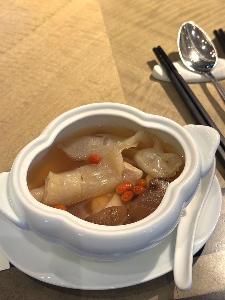 燉湯也是不容錯過的隱藏寶藏,我們點了松茸干貝螺花椒雞湯,遵循古法長時間慢燉,湯頭清澈見底卻韻味無窮,完美體現了粵菜中「醫食同源」的溫潤力量呀。